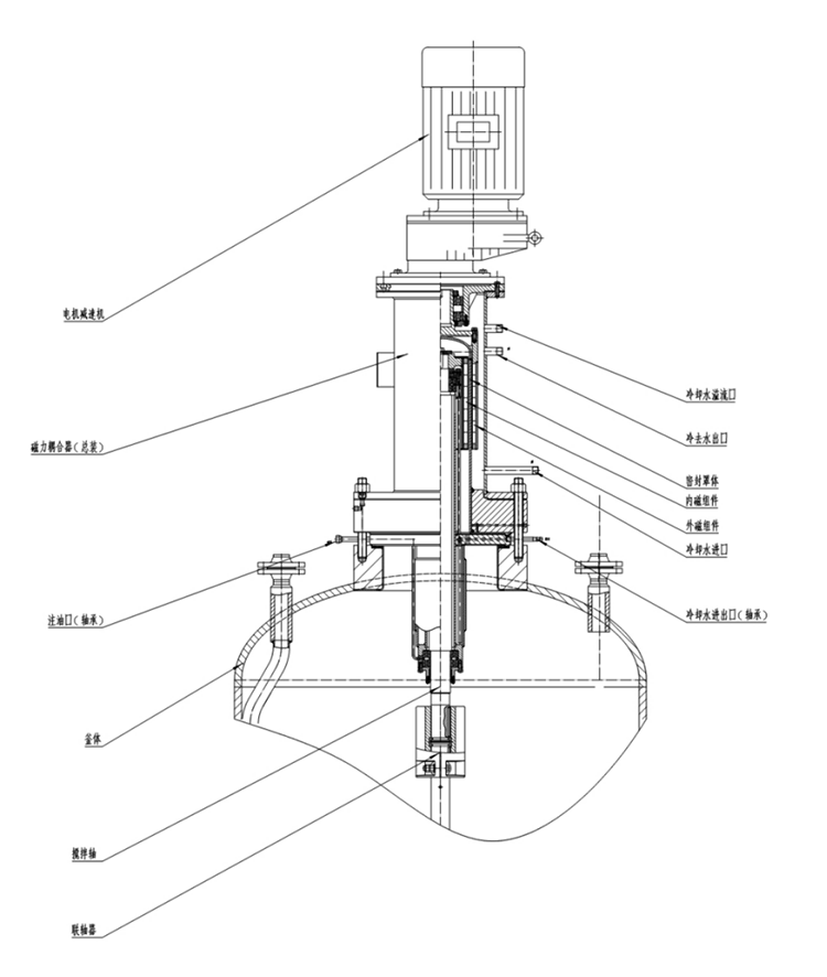 用稀土永磁制作的強磁回轉(zhuǎn)式耦合結(jié)構(gòu)(磁力驅(qū)動裝置),磁力驅(qū)動裝置的基本制造材料均為鐵磁性物質(zhì),磁導率極佳,磁場在穿過用于密封合金層時幾乎沒有損耗。由此外部驅(qū)動永磁體產(chǎn)生的旋轉(zhuǎn)磁場可以有效被內(nèi)部永磁體轉(zhuǎn)子接受,進而帶動反應器內(nèi)的攪拌部件進行物料混合,攪拌速度為0~300r/min,甚至更高,可配推進、槳式、錨式、框式、螺帶等各種槳。